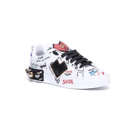 Sneaker Portofino Donna in con tomaia in pelle di vitello nappata stampata. Tallonetta in pelle di vitello con logo in gomma a microiniezione. Lacci piatti. Fussbett in pelle di vitello con etichetta logata. Fondo in gomma con spoiler in cuoio e borchie applicate. Suola in gomma logata.